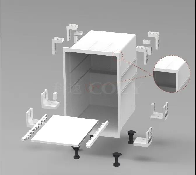 科逸橱柜柜体采用的smc材料质地紧密,一体化结构,表面光滑,脏物不易进入,且内胆采用圆弧边角设计,易于清洁,让橱柜长久如新。