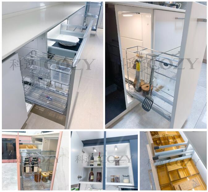 转角翻转式橱柜:能够有效利用转角空间,提高了厨房空间的利用率,通过设置翻转式的抽屉方便了不同物品的存放。